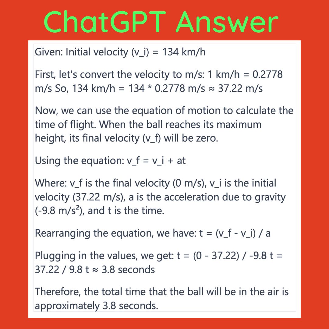 To get the total time in the air, ChatGPT’s answer of 3.8 seconds must be multiplied by two to include the time for the ball to come back down to its initial position. ChatGPT overlooked this basic step in calculating a solution since the problem clearly asked for the total time the ball was in the air.