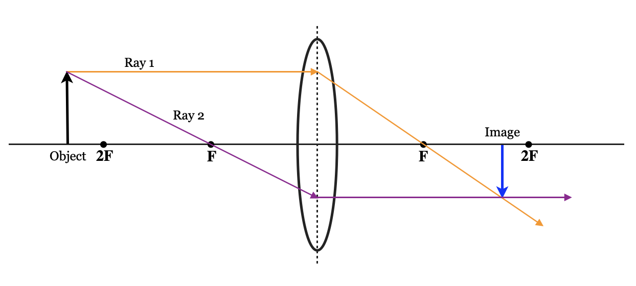 As I show my students, for every object location, to locate the image you only need to draw two rays and the two rays are drawn the same way regardless of the object location or optical device. The first ray is drawn so that it enters the lens parallel to the principal axis and is refracted so that it exits the lens through F (the focal point). The second ray is drawn so that it enters the lens through F and is refracted so that it exits the lens parallel to the principal axis. The image is located at the point of intersection of these two rays. Of course mirrors reflect rather than refract, but the answers are the same as those for a lens.